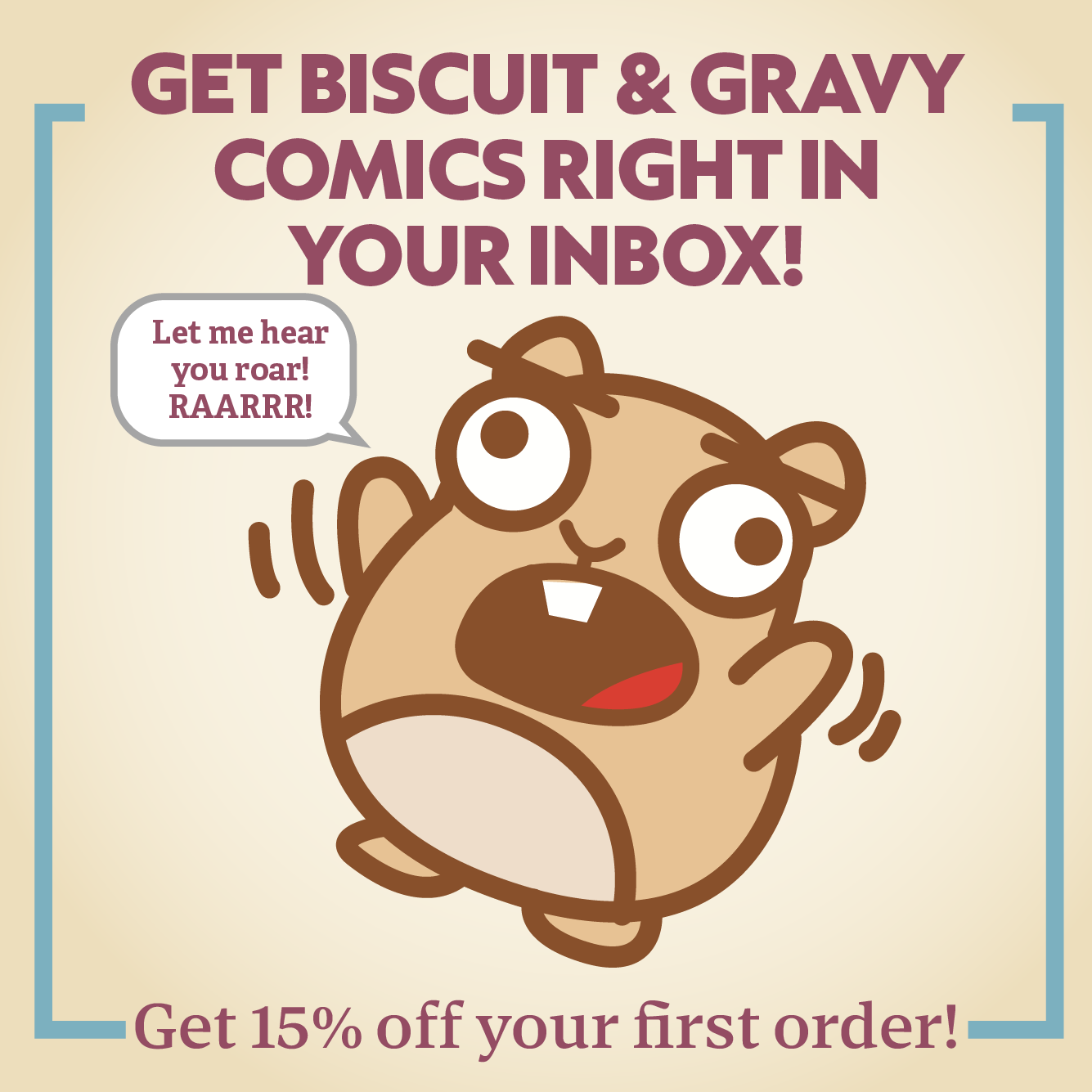 Get 15% off your first order and weekly Biscuit & Gravy comics in your inbox! !